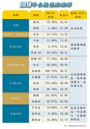 蕭乾祥認為,明年電子股動能仍強,但個股表現差異大。例如,蘋概股族群明年要留意的不是手機主體,而是其延伸出來的技術,像是3D感測、指紋辨識等技術。而搭上全球電動車趨勢的貿聯-KY、和大、美琪瑪等,雖然今年已漲一大段,明年仍有成長空間,但投資人要懂得拿捏進場時機,最好等本益比低於30倍再進場。此外,AI概念股如台積電、創意及新唐等,仍舊是明星。