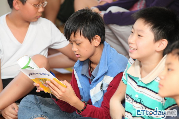◄學童正閱讀《希望小富翁,輕鬆學理財》手冊。(圖/富邦金提供)