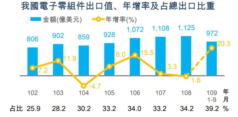 我國是亞太地區消費電子產業鏈的一環,另外為配合外一組裝廠商順利產出,長期以來電子零組件外銷比重偏高,近七年大約都在七成七左右。受惠於智慧型手機、網通及科技創新,近年我國電子零組件出口表現優於整體平均,今年前三季年增率超過20%,占總出口比重空前一路走高,前九月比重達29.2%空前高點。