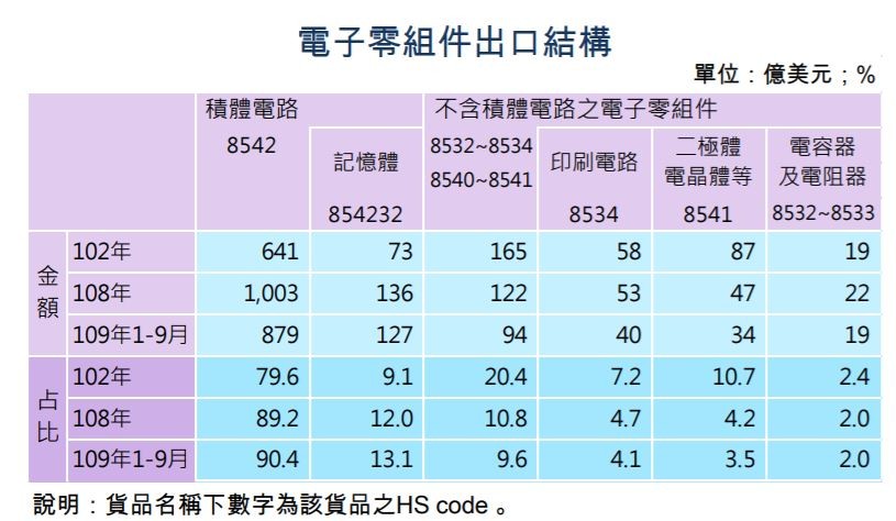 我國電子零組件出口以積體電路為主體,除因晶圓代工及封測產業技術領先,並兼有記憶體製造優勢,占比逐年上升,今年前9月突破九成,而印刷電路、二極體、被動元件等產業因先後赴海外投資,且國外產能均已高過國內,故出口趨於式微。