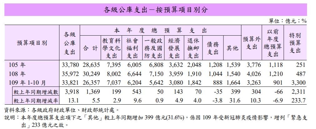 而今年前十月各級公庫支出3兆3,821 億元,較去年同期增加3918億元,年增率13.1%,其中今年度總預算支出2 兆6357億元,包含教育科學文化支出、社會福利支出、一般政務及國防支出、經濟發展支出、退休撫卹支出與其他等。