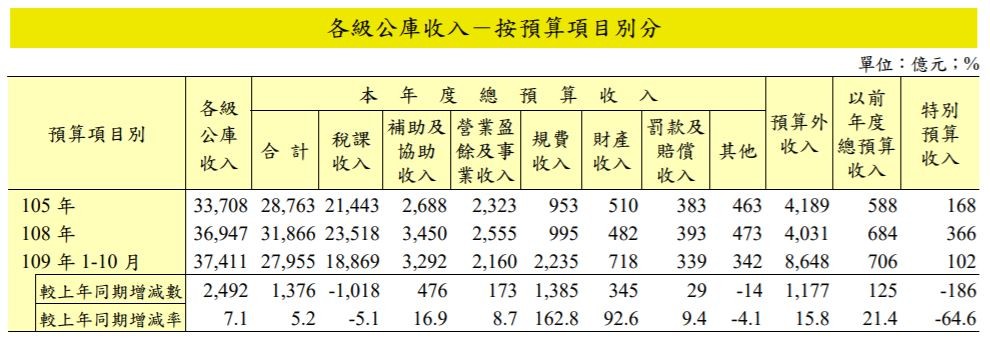 根據財政部統計,今年前十月各級公庫收入達3兆7411億元,較去年同期增加2492億元,年增7.1%;收入來源除了今年度總預算收入2兆7955億元,預算外收入為8648億元,以前年度總預算以及特別預算收入則有808億元。