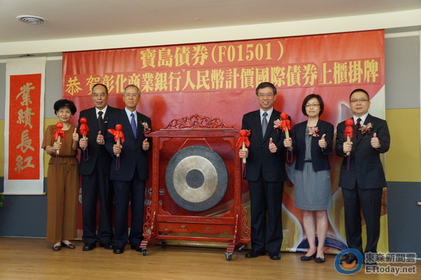 ▲彰銀寶島債29日於櫃買中心舉辦上櫃掛牌典禮,元大寶來證券副董事長黃古彬(左二)、彰化銀行董事長陳淮舟(左三)、櫃買中心總經理李啟賢(右三)等貴賓共同敲鑼,慶祝債券市場再添生力軍! 彰銀寶島債由元大寶來證券擔任銷售財務顧問。(圖/記者蔡怡杼攝)