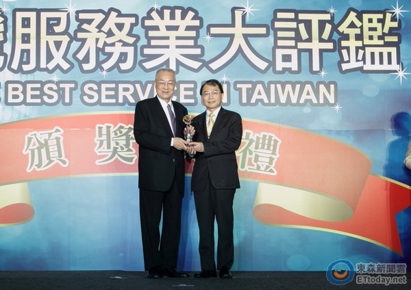 ▲永慶房產集團榮獲服務業大評鑑金獎,總經理廖本勝(右),自副總統吳敦義(左)手中接下獎座。(圖/永慶房產集團提供)