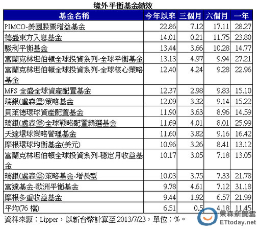 根據理柏統計,今年來表現出色的境外平衡基金中,PIMCO美國股票增益基金今年來報酬率達23%居冠,持股以美國為主,其次為德盛東方入息基金,今年報酬率為14%,布局上則以日本為主,駿利平衡基金則以13.44%的報酬率位居第三,則以美國為最大持股國。
