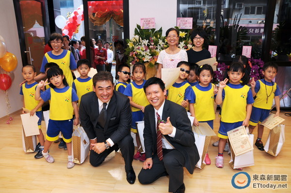 ▲台新銀行文山分行歡慶開幕,邀請當地學童參加開幕活動與園遊會,學童並和林尚愷資深副總及該分行張哲祥經理合影。(圖/台新銀提供)