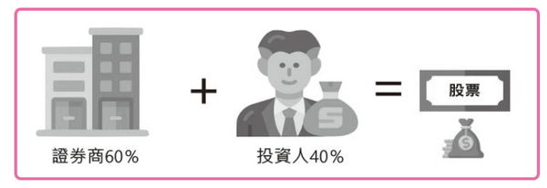 舉例來說,若融資成數是6成,當投資人融資買進股票時,證券商會借給投資人6成的現金,如: