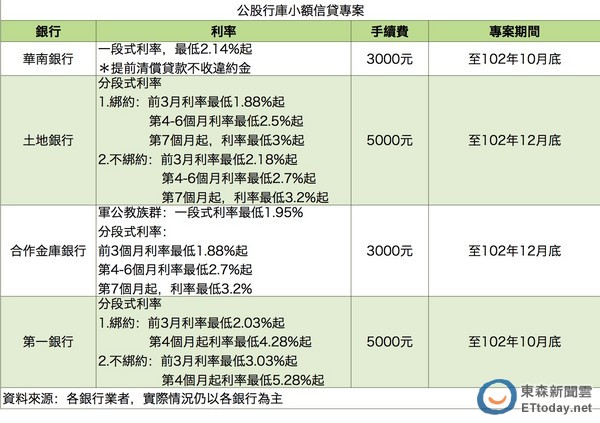 至於第一銀行以及土地銀行也都有推出分段式信貸專案,其中,土銀「卡優貸」信貸專案,前三個月最低利率1.88%,第四個月起,利率最低2.5%,第7個月最低3%;若不想綁約,受制提前清償貸款須付違約金,則前三個月利率最低2.18%,第四個月起利率最低2.7%起,第七個月起利率最低3.2%起,手續費為5000元,受理期間至年底。