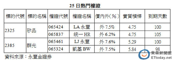 永豐金證券表示,連結群光的認購權證近期相當受到投資人青睞,昨(24)日佔市場成交比重1.15%,成交量達一萬七千張,今日亦有一萬五千張水準,投資人可留意目前成交量第一的永豐LJ(065461),報價積極,隱波穩定。