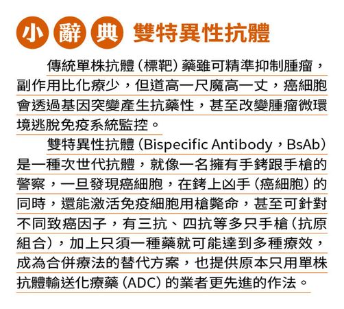 只不過,單抗藥物仍有治療盲點。「比起化療用的小分子藥,單抗藥雖精準、用量與副作用都少,但對癌細胞卻不一定100%有反應,因為會產生抗藥性」。為提高癌症病患5年存活率,類似「1加1大於2」的雙抗藥物就此成為新趨勢。「它利用不同單抗藥進行組合,只須一種藥發揮作用,就能提高治癒率。」何正宏指出。
