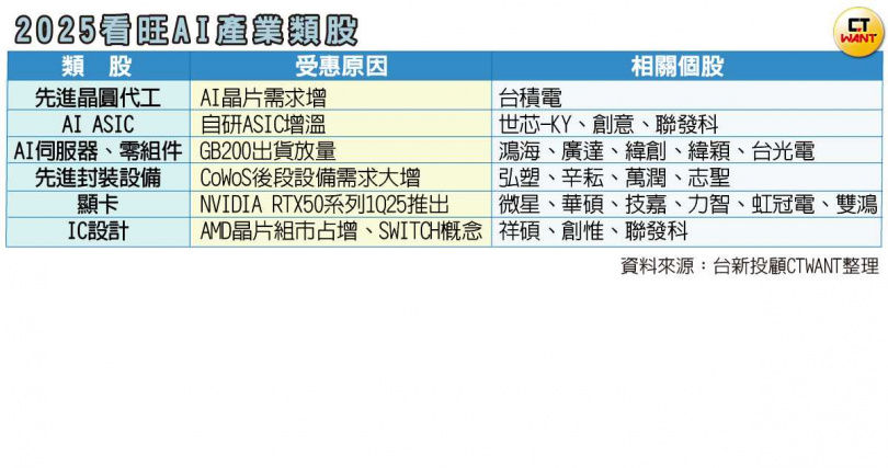 黃文清與台新投顧團隊整理2025看好產業類股,包括台積電先進晶圓代工業,延伸到AI ASIC、AI伺服器及零組件、先進封裝設備、顯卡、IC設計等。以AI伺服器美國產能布局來看,鴻海(2317)、廣達(2382)市占率約六成,前者可透過德州廠出貨,後者於墨西哥無伺服器產能,受關稅影響程度低。