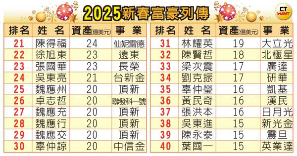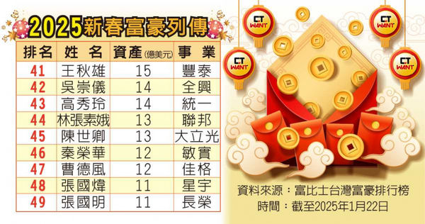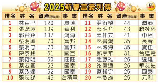 展望2025年,AI熱潮持續增溫,但美國總統川普上任後,多變的經貿新政和美元匯率及利率政策,加上地緣政治衝突、氣候變遷等問題,讓全球經濟情勢波動變大,不確定性成常態,但看台灣富豪們如何在蛇年中運籌帷幄,再顯身手。