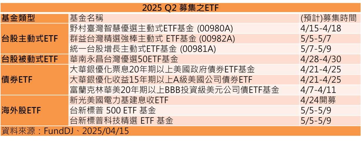 近期金融市場波動加劇,但新基金募集潮仍持續,又以ETF的募集檔數最多,其中主動式ETF最受外界闗注,包括本周募集的野村臺灣智慧優選主動式ETF(00980A),以及5月將募的群益台灣精選強棒主動式 ETF(00982A)、統一台股增長主動式ETF(00981A),股票代號皆增列「A」字掛牌,專家表示,由於主動式ETF是透過基金經理人操盤以更積極的方式追求基金績效,加上此時碰到台股回檔之際有利低檔布局,市場推估,相較去年多檔被動式ETF選在台股高檔發行,逐漸面臨股息配不出窘境,主動式ETF站有有利發行時點上。
