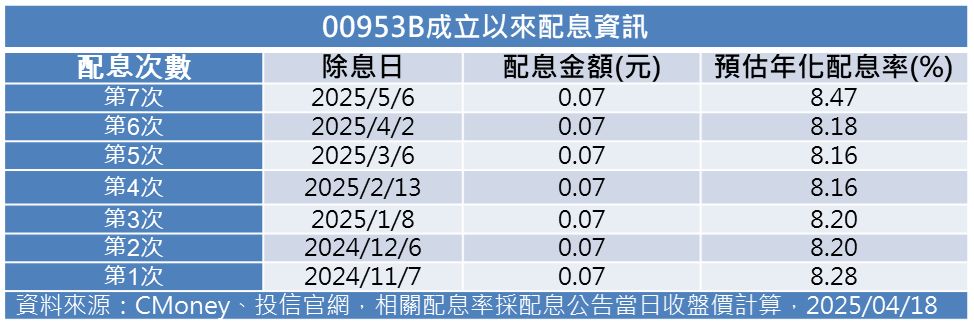 債券ETF人氣王-群益優選非投等債(00953B)在今(18)日公告第七次配息資訊,根據群益投信官網最新配息公告顯示,本次預估每股配發金額為0.07元,維持新高,以今日收盤價9.92元來推算,預估單次配息率近0.71%、年化配息率約8.47%,本次除息日為5月6日,若要參與除息最晚需在5月5日買進,收益分配發放日則訂於5月29日。