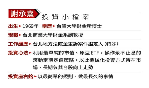 用最單純的原則,做最長久的操作,照樣可順利達到目標。台北商業大學財務金融系副教授謝承熹14多年來靠著「定期定值目標追蹤法」滾出2,600萬元,累積出146張0050;機械化執行、定期買進0050,讓他賺到安穩睡眠及和家人的相處時間,他的操作證明,就算是冷門投資法,長期下來也能有豐碩成績。