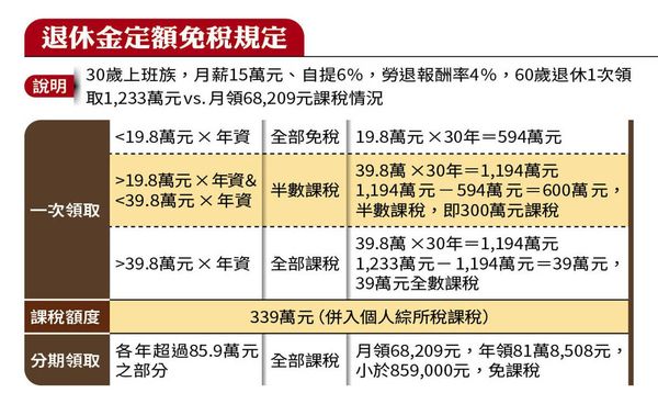 他舉一個極端例子,一位30歲年輕人,一開始工作就自提6%,投保薪資是最高級距15萬元、年投報率4%、年資30年,到60歲一次請領勞退可領1,233萬元,扣除免稅額594萬元後,剩餘的639萬元必須半數、或全數課稅,併入當年度個人綜所稅繳付稅金。但若選擇月領,則每月可領68,209元,即年領818,508元,低於年領要課稅的門檻859,000元,因此免稅。