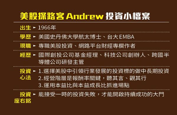 臉書粉絲團「美股探路客」版主Andrew創投出身,投資經歷超過20年,靠著選對賽道、順勢而為,創造年化報酬率25%的亮眼成績。正因是創投出身,Andrew對於「投資後管理」有一套嚴謹的紀律。