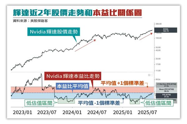 至於現在輝達估值如何?「以10月17日股價約183美元來看,PE約32.1倍、略高於中位數平均值30.7倍,PEG約0.9倍,略低於負一個標準差的1.14倍,可以看出整體估值合理略低。」他給出答案。