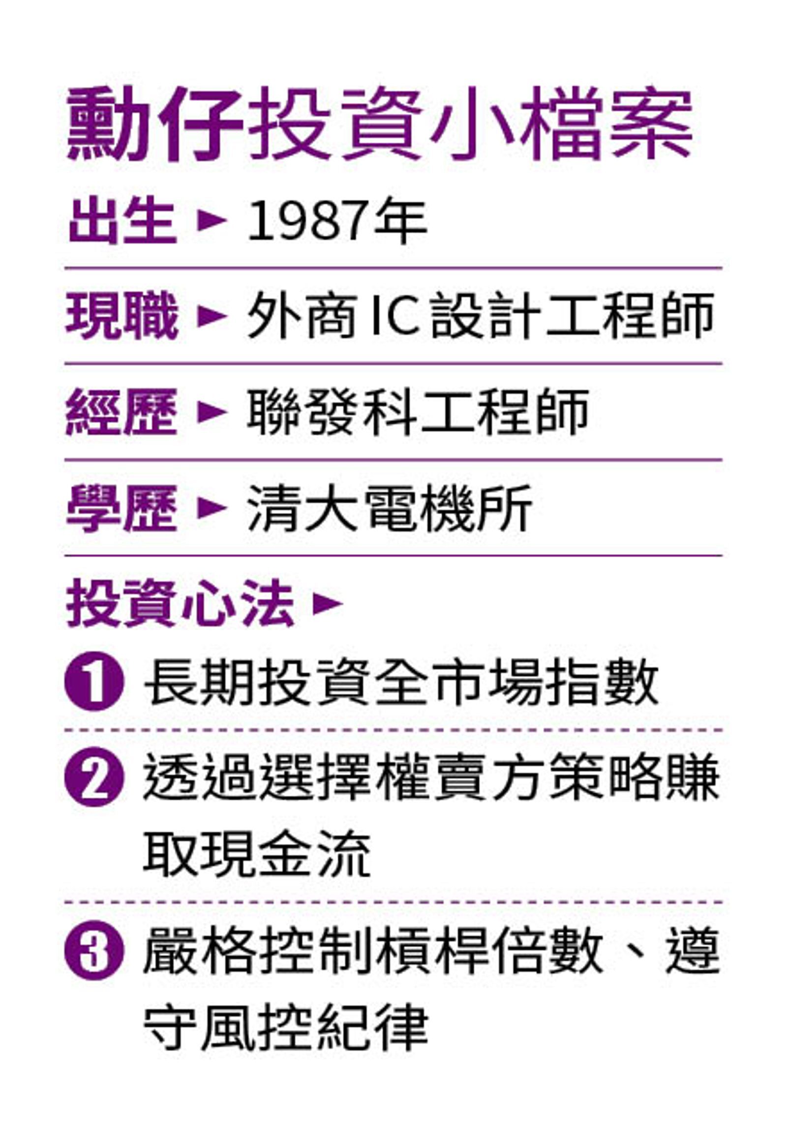 近3年,勳仔投資轉向期貨選擇權。「持有台指期合約,是真正投資完整的加權指數,不論大型權值股或中小型股都涵蓋在內,就分散風險、貼近大盤這兩項需求來看,台指期都是更好的選擇。再搭配台指選擇權,就有更多不同策略,不論是避險或創造現金流,都可提高勝率。」