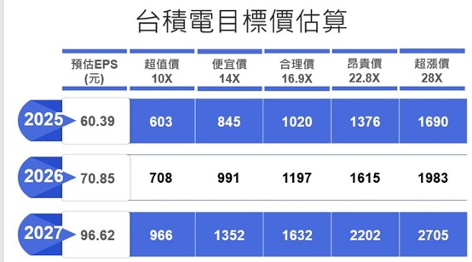另外,他用本益比估價法,算出台積電的甜甜價,股價跌破1,400元就是好買點,他以法人預估的均值來看,2026年每股純益70.85元,2027年每股純益96.62元,以11/27收盤價1,435元計算,2026年的本益比為20.25倍為合理價,2027年的本益比為14.85倍,落在便宜區間。