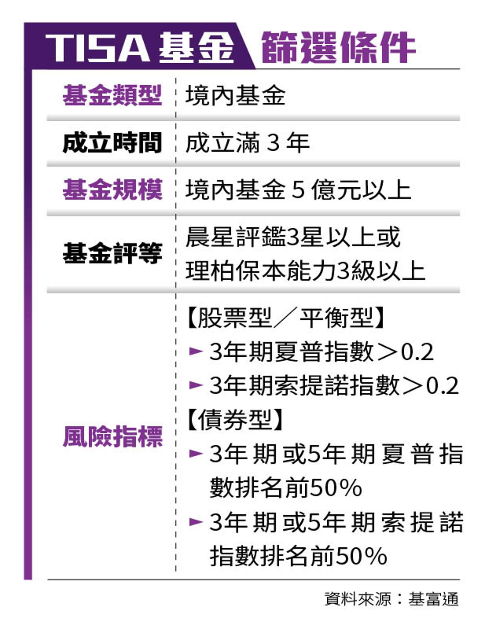 網路基金交易平台基富通表示,TISA是金管會推動的「台灣個人投資儲蓄帳戶」,並非新成立發行的產品,而是從市場上現有銷售的基金中,透過成立時間、規模、基金指標及機構評鑑等條件把關,篩選出適格基金,再由投信公司發行「TISA級別」;「投資策略與持股內容,皆與原有基金相同,最大差異就在經理費率較低、且需定期定額扣款滿2年。」