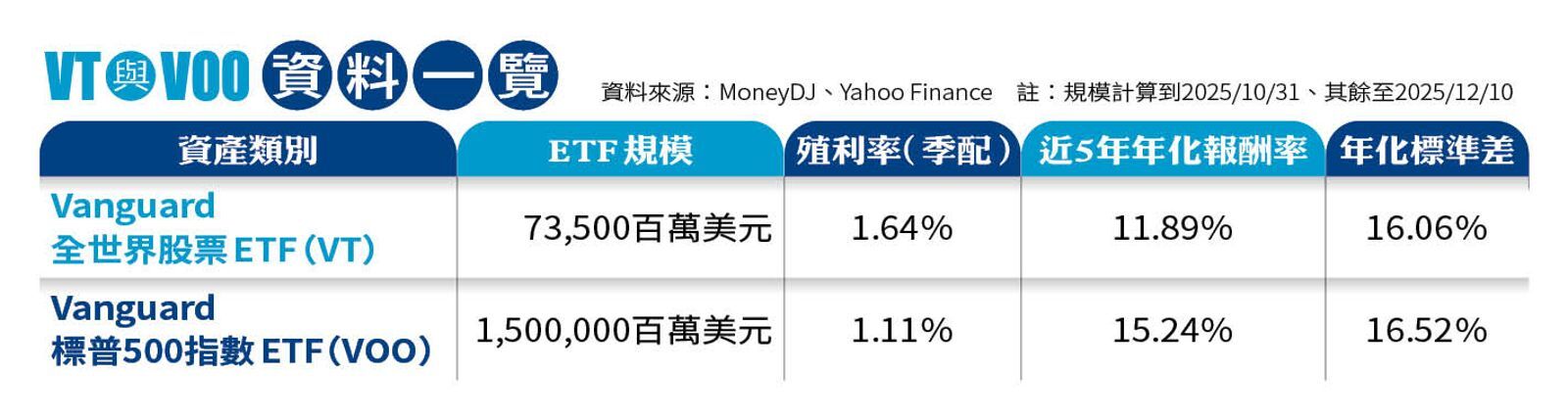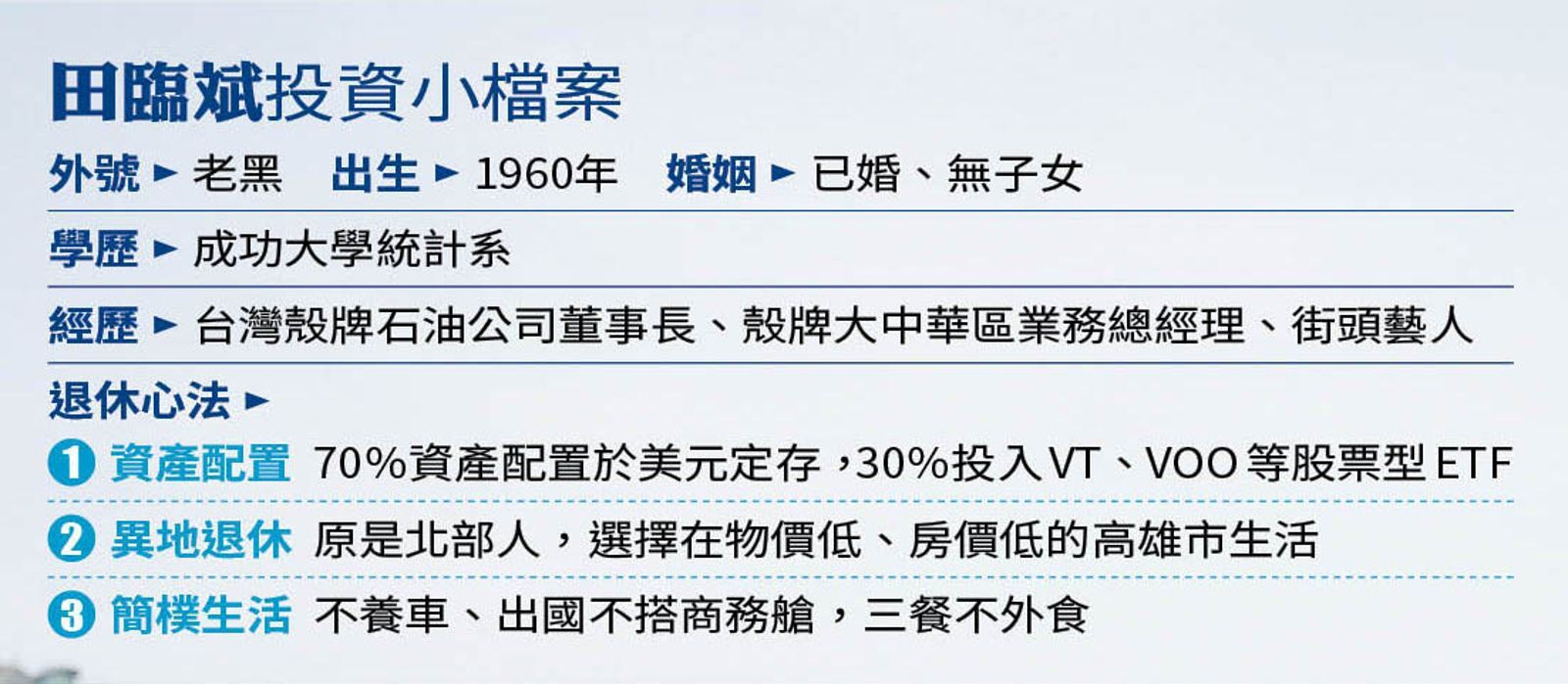 隨著退休生活逐漸穩定,約在6年前,田臨斌觀察到市場環境改變,以及對單一債券風險的重新評估,他意識到,雖然海外公司債提供固定配息,但若該公司發生財務危機,資產有歸零的風險,於是將資產中部分配息型商品出脫,全數換成「被動式ETF」;首選標的是全球指標性的兩檔ETF:VT(Vanguard 全世界股票ETF)與VOO(Vanguard標普500指數ETF),但仍保留70%的美元定存。