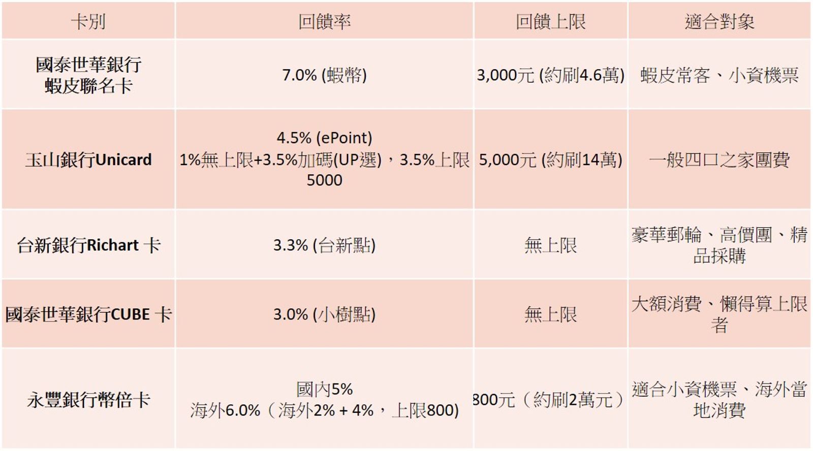 如果不想要蝦幣,其他刷機票、團費好用的卡,可以考慮永豐銀行幣倍卡、玉山銀行unicard、台新Richart卡、國泰世華銀行cube卡等,不過要取決團費與回饋金多寡,才能比較出哪張卡適合當次出國旅行。