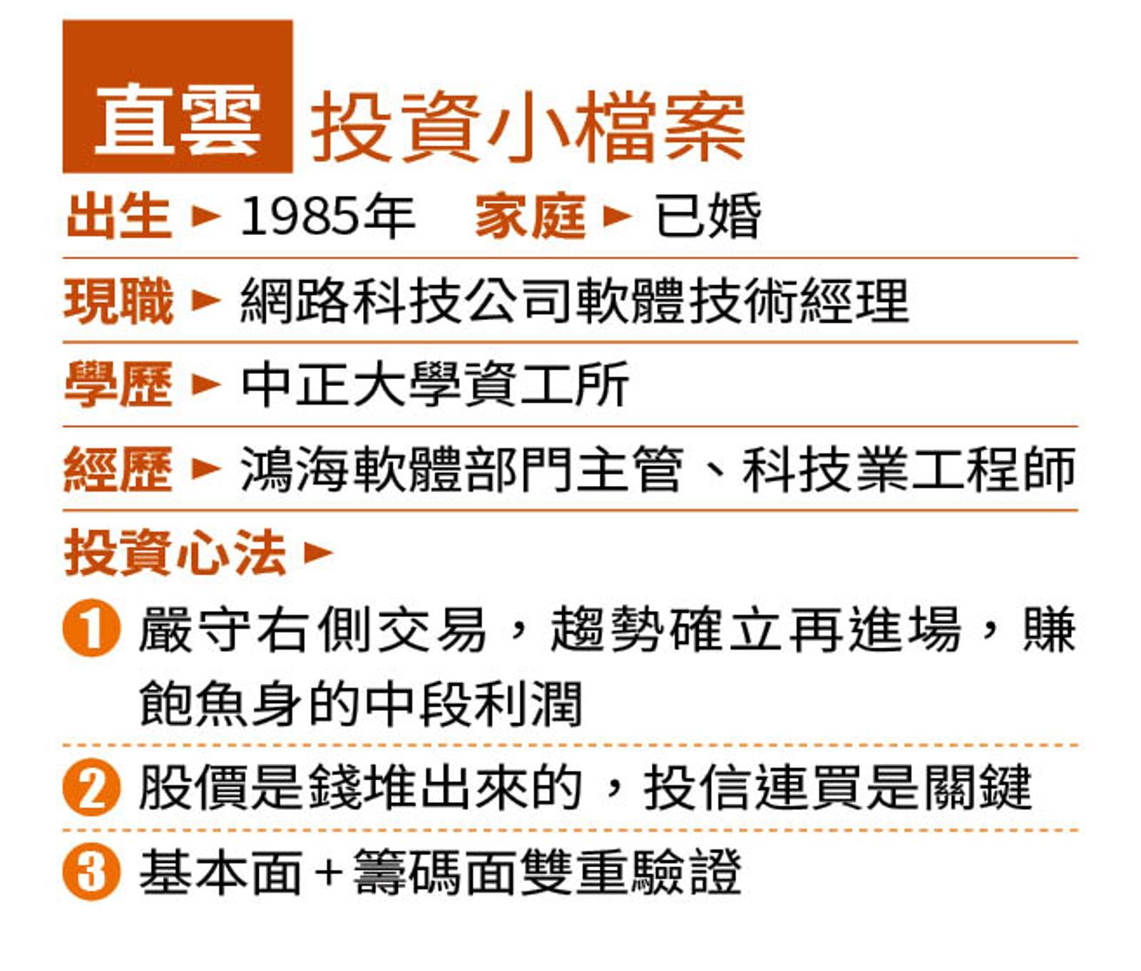 直雲說自己是右側交易派(又稱順勢交易,指確認趨勢後再入場),「我不會因為起漲點沒買到就不買,因為很多股票第一波漲勢可能是假性復甦,我會耐心確認再進場,雖然少賺一點,但風險低很多。」先看大方向,抓到主流題材,再精挑具備基本面的標的,「每月營收年增率持續正成長就是訊號。」