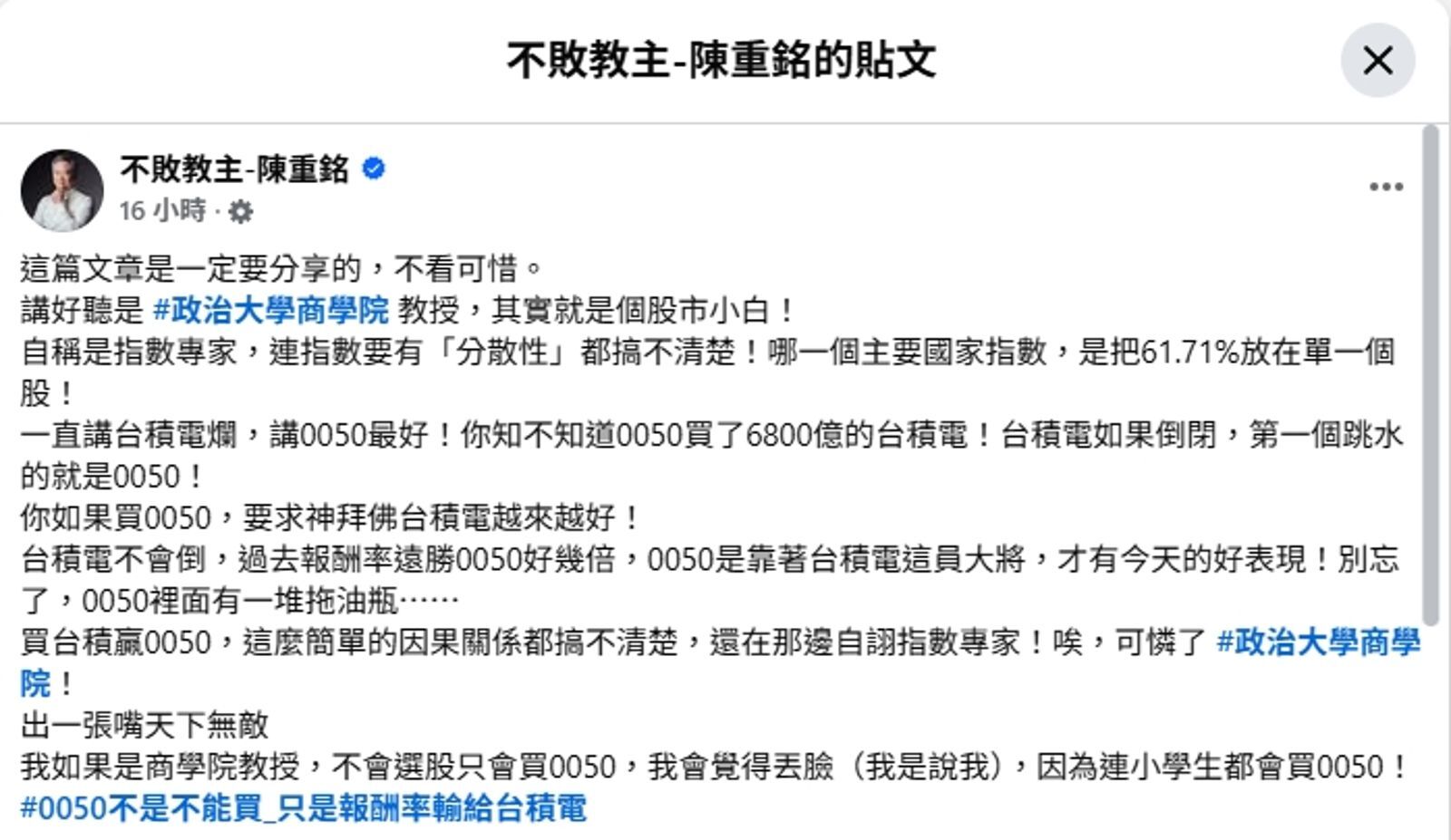 而周冠男與巨人傑對於「短線交易」或「指數投資」策略,隔空交火,陳重銘也在臉書分享,加入論戰,他甚至直言「如果當教授只會買0050,我會覺得丟臉,因為連小學生都會買。」字字句句狂妄,其實他要表達的是,投資不是選邊站,而是勤做功課、深入理解後,選擇適合自己的投資路。