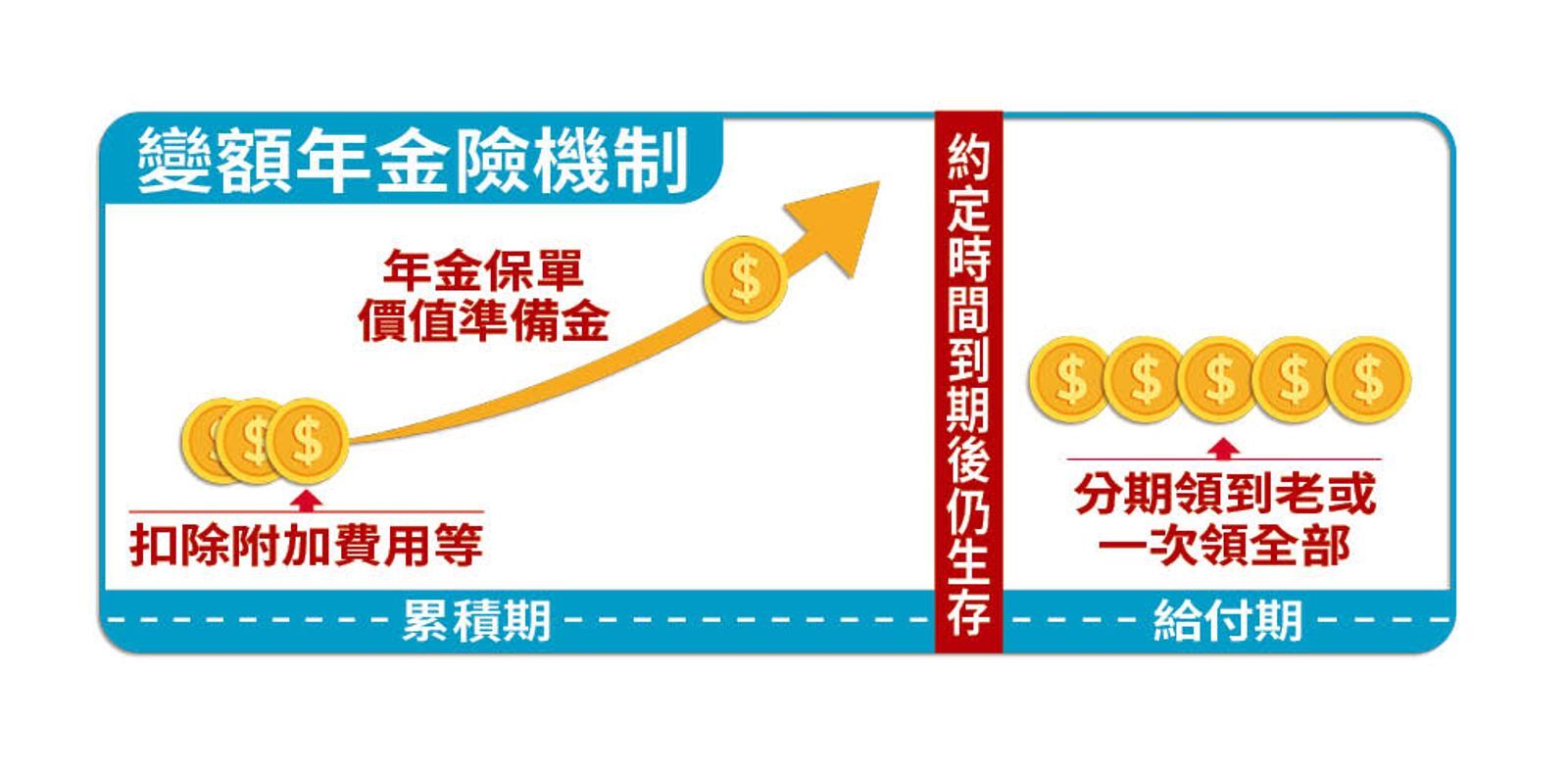 捷安達保經董事長吳鴻麟表示,台灣人雖然會買年金險、卻鮮少有人會將年金險擺到進入年金給付。拆解變額年金險的架構,主要分成年金累積期及年金給付期,累積期間就像勞退,靠投資報酬率存下老年資產;而保戶能跟保險公司約定一個年齡進入年金給付期,將累積下的投資資產轉為年金化,月月領,就像勞保一樣可活到老、領到老,最長能領到被保險人110歲。