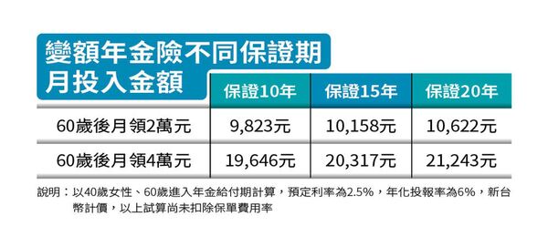 以國內大型壽險公司變額年金險試算,10年、15年、20年三種不同保證期,若預定利率為2.5%,保證期間為10年,女性保戶40歲購買、到60歲進入年金給付,每月投入9,823元,年投報率6%,未來可月領2萬元。加上勞保和勞退且參加自提,一般來說可月領4萬元,那麼,退休後就可以達到月領6萬元的目標,重點是不論市場怎麼起伏,這筆錢都是確定可以拿到的現金流。