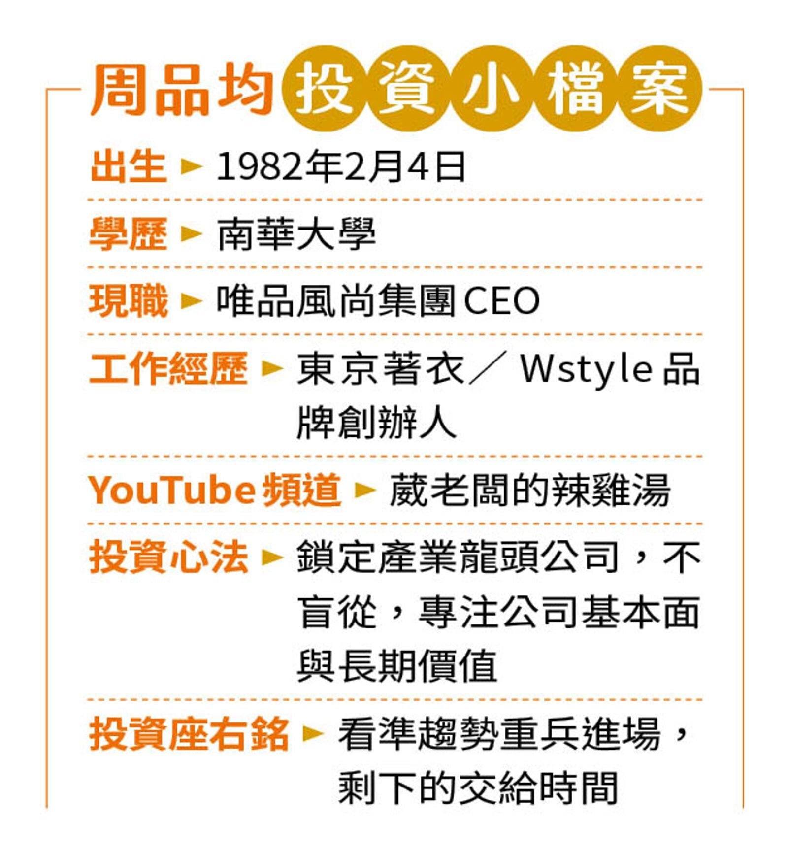 「經營公司,早就習慣看很大的數字,營收億元、貨款數百萬元,這些經歷形塑了我的投資風格。」前東京著衣、現Wstyle品牌執行長周品均受訪時語氣從容、有問必答。她笑說,投資這件事,最後一定回到每個人的本性,「我很清楚自己不是求穩的類型,跟創業一樣,能承受相對高的風險,對市場的耐受度也較高。」