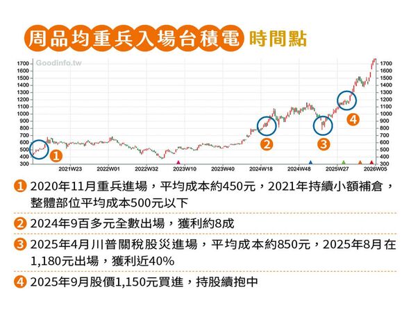 2025年4月,川普關稅引發台股重挫,台積電股價回檔至800元以下,市場瀰漫恐慌氛圍,這時周品均卻選擇逆勢承接,從850元一路進貨至880元,「有人說會跌到600多元,但我覺得那只是短期干擾。」她隨後在股價1,180元附近調節,波段獲利近四成。周品均直言,恐慌時才有破盤價,「股價打折,難得一見,當然要接。」