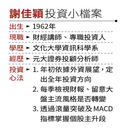 近幾年台股持續走多,謝佳穎逮住主流股波段操作,每年報酬率幾乎都維持在35%至4成左右的好成績。隨著盤勢進入高檔震盪區,他坦言,目前持股水位約6成,配合今年震盪機會大,投資心態會偏向審慎,以較長的波段操作為主。