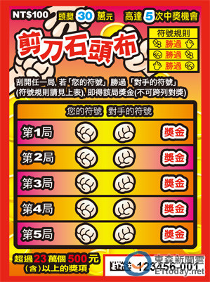 台彩表示,「剪刀石頭布」刮刮樂,每張售價100元,以大家最熟悉的猜拳遊戲為主題,搭配簡單可愛的「剪刀」、「石頭」、「布」手勢作為遊戲符號,只要猜贏對手即能贏得獎金,讓彩迷用刮的就能在紙上享受猜拳的樂趣,該款遊戲提供頭獎30萬元與超過23萬個500元﹙含﹚以上的獎項,每張都有高達5次中獎機會,整體中獎率為29.05%。