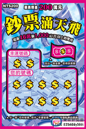 至於今日三款刮刮樂商品中,以「鈔票滿天飛」中獎率31.15%最高,票面設計以空中飛舞的千元大鈔與鋪滿鈔票的遊戲刮區為主視覺,超過16萬個1,000元(含)以上獎項,象徵鈔票從天而降,提供深受彩迷喜愛的「對幸運號碼」玩法,最高頭獎獎金200萬元!