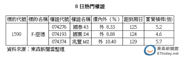 8日股價的上漲,同步也帶動權證的漲幅,約略漲勢介於20%以上,如國泰43(074276)收盤上漲22.22%,國票D4(074193)上漲24.29%,兆豐MZ(074374)也有31.43%的漲幅。