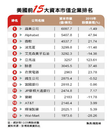電子商務是貫穿二○一五年一整年的股市大贏家。從最新的美國資本前十五大企業發現,亞馬遜的資本市值已超過三二○○億美元;幾個星期前,亞馬遜的資本市值一度超越艾克森美孚石油,目前和艾克森美孚石油資本市值的差距僅約三五億美元。假如油價還不能止跌,加上亞馬遜股價再創歷史新高的話,亞馬遜的市值就可能超越艾克森美孚石油。臉書的資本市值也超越三千億美元,排名美國第七大市值企業。Alphabet(Google母公司)一五年股價漲幅達四九%,資本市值超過五三○六億美元。