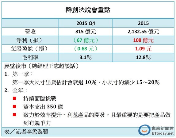 群創(3481)今天下午召開法說會,並公布去年財報,公司2015年第四季稅後淨損為67億元,以全年來看,稅後淨利新為108億元,每股盈餘1.09元。總經理王志超表示,雖然未達預期,但整體表現還算好。