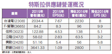 身為全球電動車領導廠商,特斯拉(Tesla)儘管第一季銷售狀況不如外界預期,不過其推出的平價入門車種Model 3訂單卻是大爆量,加上為了搶攻中國市場,傳出將跟中國長安汽車合作,接連的好消息,讓特斯拉前景更加明亮,也讓相關供應鏈台達電(2308)、F-貿聯(3665)、信邦(3023)、立隆(2472)、興勤(2428)、群創(3481)等可望持續受惠。