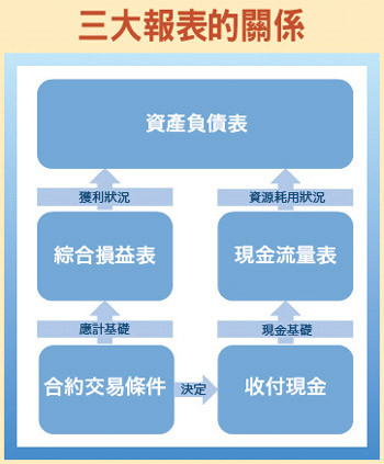 資產負債表是顯示資源的應用狀況,綜合損益表反映確實的獲利情況,現金流量表反映現金這項資源的應用狀況,三者關係請見附圖。