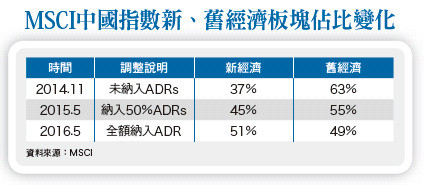 全球產業結構持續快速變化,中國也無法自外於這股趨勢力量。在美國上市的大陸海外企業存託憑證(ADR)五月全額納入MSCI中國指數後,資訊科技權重躍升至與大陸金融板塊相同的地位,大陸新經濟板塊權重首度超越舊經濟。