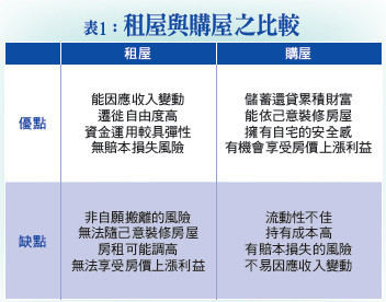 租屋和購屋都能滿足居住需求,個人及家庭可視其條件作選擇。表一整理租屋及購屋的優缺點,以下作簡要說明。
