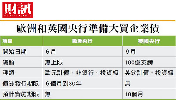 而在兩個月前,歐洲央行(ECB)正式展開購買投資級企業債,金額無上限。上個月中旬ECB首度公布購買公司債的帳目,實施六週以來,每週買進3億歐元(約106億元台幣),總額104億歐元(約3,700百億元台幣),合計150多家公司。
