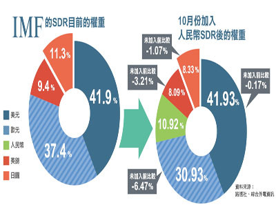 當然主辦G20高峰會也不會讓中國GDP馬上翻上來,中國經濟成長前景趨緩仍是趨勢,持續影響未來人民幣的後市。人民幣即將在十月一日正式納入IMF的SDR,剛納入SDR的權重就有十.九二%,是僅次於美元、歐元的第三大儲備貨幣,這對人民幣國際化將邁進一大步。為了讓人民幣成為SDR儲備貨幣,歐元的權重減少六.四七%,英鎊減少三.二一%,日圓減少一.○七%,歐系貨幣的歐元和英鎊被調降權重的比重最高,這次美元權重僅微幅減少○.一七%,和人民幣未納入SDR前沒差多少。所以,美元還是全球最強勢的貨幣。