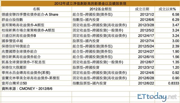 今年來國內投信發行的29檔新基金中,其中,有14檔淨值創新高,而成立以來績效最佳並達6%以上,分別為債券型基金德盛安聯四季豐收債券組合-A Share的6.58%,以及指數型的群益台股指數基金6.29%,堪稱新基金中的股債雙雄,表現特別亮麗。群益投信表示,台股7月雖呈現小跌的震盪行情,但預期8月在成交量逐步回溫下,指數有望延續7月底的多頭走勢。
